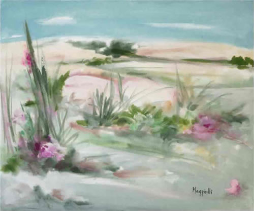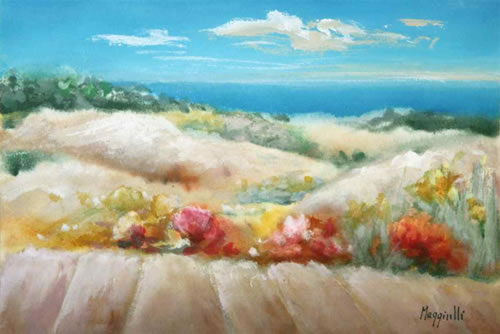 Paesaggi della Murgia pugliese arida e pietosa, figure femminili, fiori, volti di donna sono da sempre i temi che Clelia Maggiulli preferisce fissare nelle sue tele.